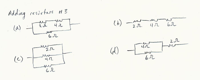 1/Rp = 1/R1 + 1/R2 + 1/R3 = 3/R ⇒ R = (3)(0.667 Ω) = 2 Ω